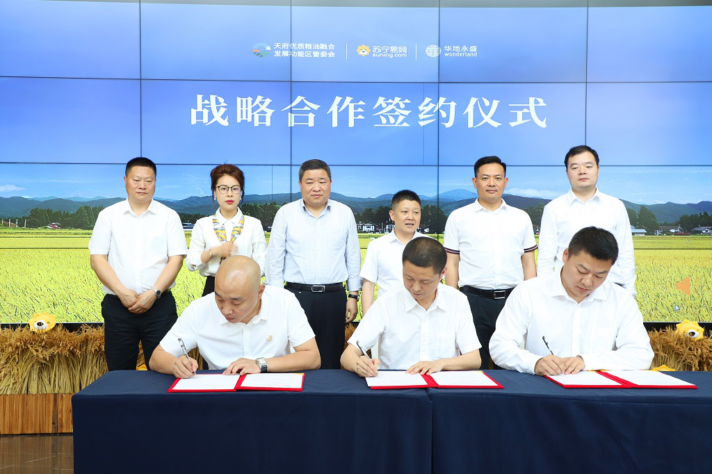 2019年5月18日,天府優(yōu)質(zhì)糧油融合發(fā)展功能區(qū)管委會(huì)、蘇寧易購、華地永盛戰(zhàn)略合作簽約儀式在華川集團(tuán)天府良倉農(nóng)業(yè)總部隆重舉行。中共崇州市常委、總工會(huì)主席王成龍、天府優(yōu)質(zhì)糧油融合發(fā)展功能區(qū)管委會(huì)黨工委副書記廖慶、蘇寧易購集團(tuán)西南地區(qū)執(zhí)行副總裁兼成都地區(qū)管理中心總經(jīng)理?xiàng)钊f波、四川蘇寧易購超市公司副總經(jīng)理尹小璐等代表出席本次活動(dòng)。華川集團(tuán)黨委委員、副總裁楊開榮、華地永盛農(nóng)業(yè)發(fā)展有限公司總經(jīng)理鄭舒姍對(duì)出席本次活動(dòng)的代表嘉賓表示熱烈歡迎。