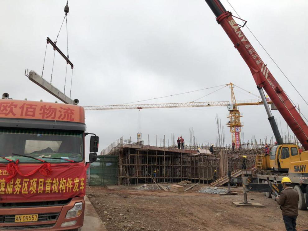 12月3日下午4時(shí)許,在清脆的爆竹聲中,在克服了層層困難后,懷芷高速房建項(xiàng)目芷江服務(wù)區(qū)北區(qū)綜合樓首批預(yù)制PC構(gòu)件到達(dá)吊裝現(xiàn)場(chǎng)開始組裝作業(yè)。